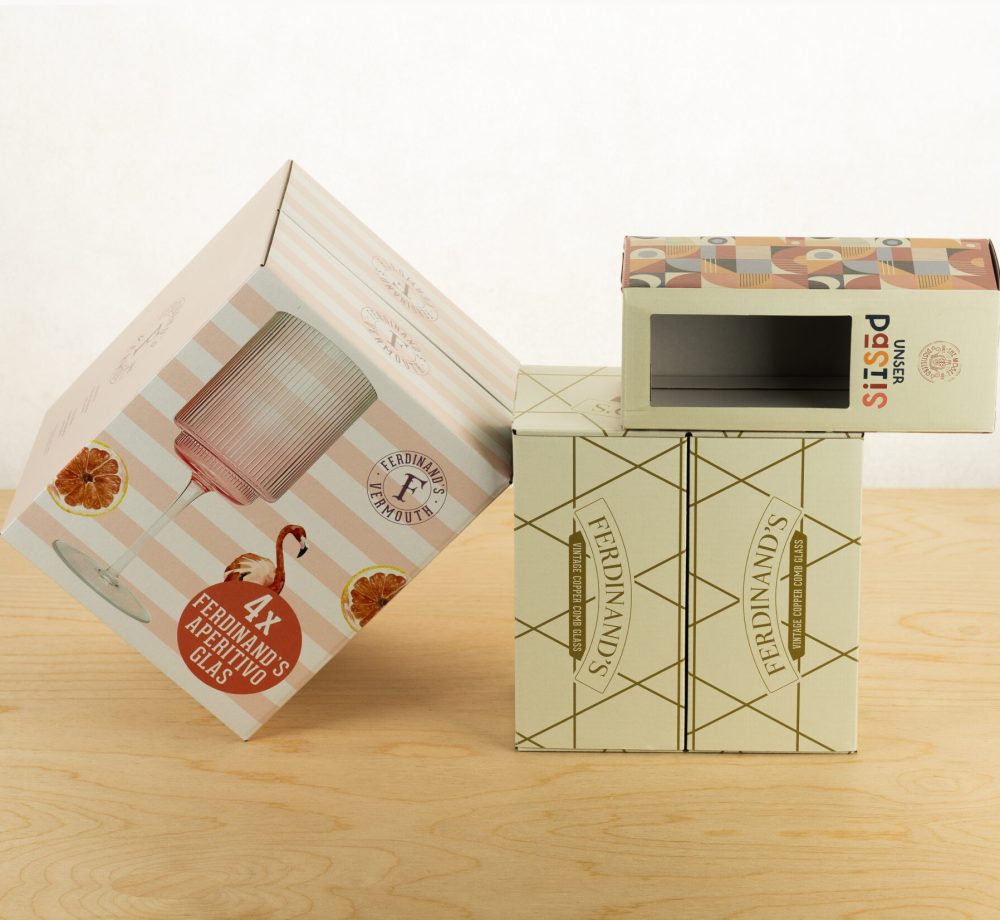 Pro vizuální kontakt s produkty navrhneme okénko na míru, případně i s vlepenou folií pro ochranu obsahu. Dárkové odnosky na víno dodáváme ve standardních rozměrech s potiskem už od 100 ks. Samozřejmostí je možnost výroby výsekové fixace pro Vaše produkty z lepenky na míru do krabice. Pak se nemusíte bát poškození obsahu balení a Vaši zákazníci si po otevření užijí krásnou prezentaci Vašich produktů a jednoduchou recyklaci obalu.