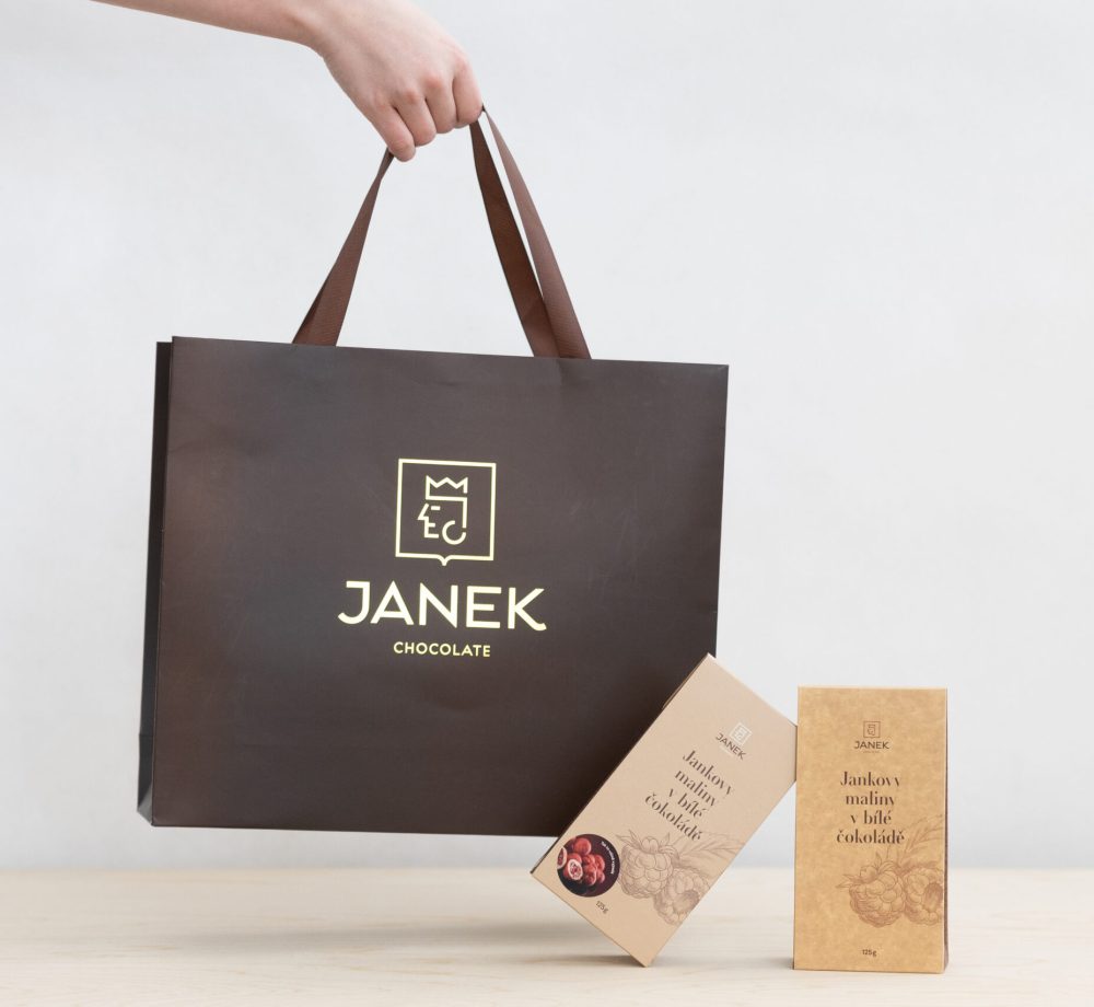 Pro dražší zboží jako jsou hodinky, šperky, elektronika a další, nabízíme luxusní tašky z křídového papíru s vícebarevným tiskem, metalickou ražbou a laminací. Příkladem takové realizace jsou krásné tašky s rozměry na míru pro Čokoládovnu Janek na fotce, se zlatou ražbou a vnitřní stuhou na zavázání. Luxusní tašky na míru pro nejlepší cenu vyrábíme od 1.000 ks v Číně. Menší náklady od 100 ks realizujeme u našich českých výrobců.